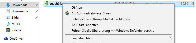 Führen Sie das Installationsprogramm als Administrator aus (klicken Sie mit der rechten Maustaste auf die Datei tnach61 und wählen Sie dann im Menü den Punkt "Als Administrator ausführen", siehe das folgende Bild).